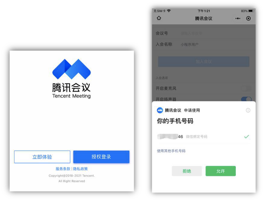 使用“腾讯会议”微信小程序时,需要进行“授权登录”和手机号码验证。允许后,输入会议号和入会名称即可成功进入会议。