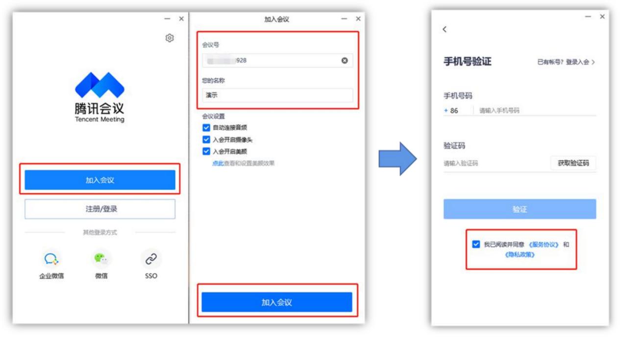 打开“腾讯会议”客户端,点击加入会议,输入会议号和考生姓名,点击加入会议,弹出手机号验证界面,输入个人手机号,获取验证码,勾选下方“我已阅读并同意《服务协议》和《隐私政策》”,点击验证,即可进入会议(线上试讲会场),注:可在会议设置中先勾选“自动连接音频”和“入会开启摄像头”。