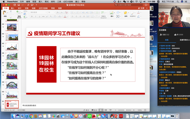 随后,黄艾老师给在线的同学们提了几点疫情期间学习工作的建议:对于毕业班的同学要落实好顶岗实习、毕业设计和就业工作,及时关注学校通知。她解读了今年专升本扩招的各项政策。叮嘱学科竞赛团队成员要在疫情期间为各项技能竞赛做好准备,并通过展示分析各项案例,使同学们对园林景观设计有了更深入的理解。还分享了在线学习如何做到不分心、提高学习自主性和学习效率的经验。她呼吁同学们要给自己一些压力和动力,生命不息,奋斗不止。