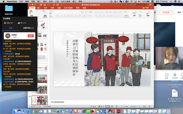首先,由人民日报、鄞州日报等广泛报道的网红手绘漫画女生18园林技术A2班郑素蓉分享创作体会。她表示作为入党积极分子,应该积极投身到志愿者队伍,用自己的绘画专长把真实的体会用漫画的方式表达出来,为抗疫战献上绵薄之力。她分享了与学院志愿者团队一起策划,看着疫情的报道和身边的感人事迹突发灵感,把所感、所想、所悟通过这样独特的方式记录下来。同时,她还给这个志愿红系列漫画作品命名为:大街小巷的“一抹红” ,并一一解析了每一幅漫画作品的意义。
