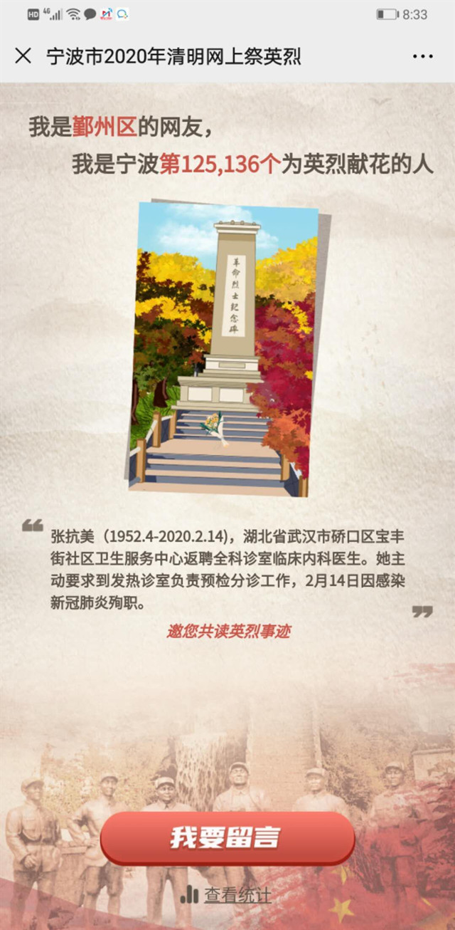 清明节是中华民族缅怀先烈、悼念逝者的传统节日。今年,全国各行各业群众尤其是医护工作人员挺身而出,甚至奉献了生命!为致敬为国家、民族做出牺牲的英烈们,3日,支部书记黄艾发出了清明“云端”缅怀先烈的倡议。党员和入党积极分子们通过登录宁波文明网“网上祭英烈”专题页面,向英烈鲜花,并在“感言寄语”处写下对革命先烈、抗疫烈士的寄语,表达崇敬感念之情。
