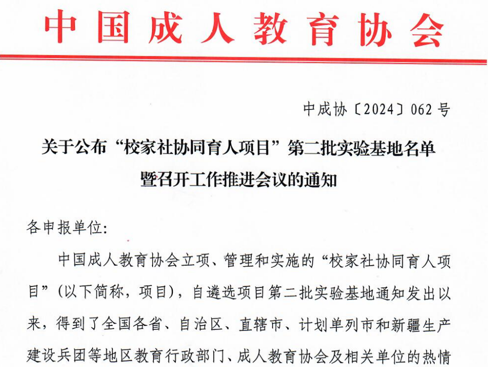 近日,中国成人教育协会发文公布了“校家社协同育人项目”第二批实验基地名单,我校培训中心成功入选。接下来,将由继续教育学院(培训与技能鉴定中心)牵头,致力于推广学校、家庭和社区“三位一体”的教育理念,通过协同育人模式,促进学生的全面发展和健康成长。