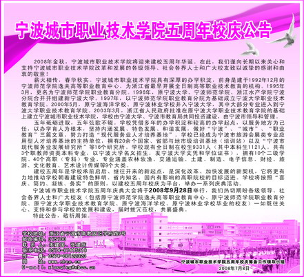 kaiyun开云官方在线入口五周年庆典大会将于2008年9月28日举行,我们热切期盼各级领导、社会各界人士和广大校友(包括原宁波师范学院逸夫高等职业教育中心、原宁波师范学院职业教育分院、原宁波大学职业技术教育学院、原宁波海洋学校、原宁波林业学校毕业的校友)一如既往关心、支持和参与学校的发展和建设,届时拨冗莅校,共襄盛典。