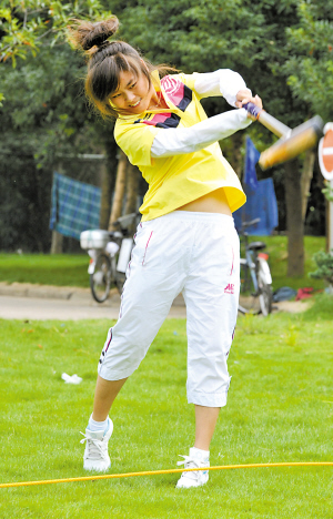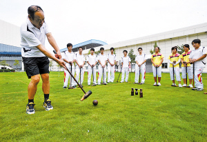 校园的一角,绿色的草坪上,几条塑料绳隔出一条条球道。10多个同学分成两队,趁着中午休息,正在起劲地练习如何挥杆击球。