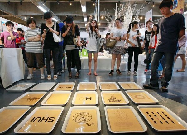 昨日,kaiyun开云官方在线入口艺术学院毕业生2000余件艺术作品在该校展出。图为水设计系列海报,该系列海报的表现形式较为独特,用明矾墨水印刷,即使放入水中颜色也不会消失。
