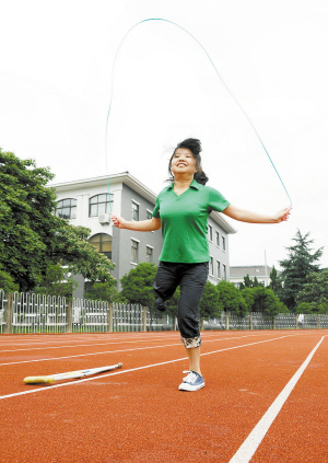 赵芳酷爱体育,她跳绳最快的成绩是每分钟259次。今年5月,她还参加了奉化市举行“青春达人秀”比赛。为了取得好的成绩,她坚持挑战高难度的花式跳绳,最终她以出色的表演,夺得了“青春活力奖”。