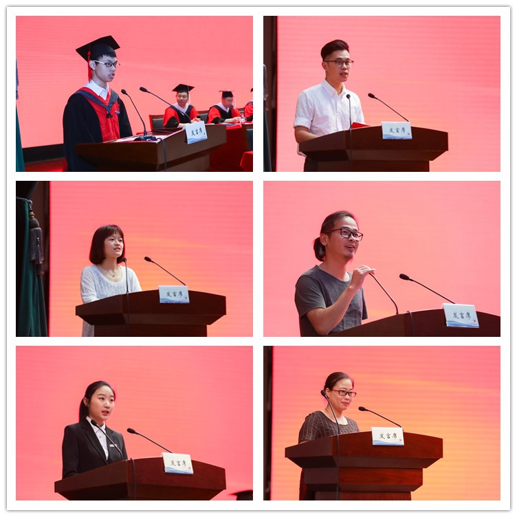 2017届优秀毕业生代表信息与智能工程学院郑阳同学结合自己在大学中的经历和收获,发表了毕业感言。艺术学院徐弘老师代表全体教师向毕业生们送上最后的谆谆教导和殷切希望。宁波华博会议展览有限公司事业部总监郁俏峰代表校企合作企业家通过各项校企合作人才培养的优秀成果向学校师生表示感谢和祝福。2008届景观生态学院毕业生沈洁代表优秀校友通过分享自己的奋斗经历与成功经验,向毕业生们表示美好的祝愿和期望。在校生代表国际学院章嘉妍同学向学长学姐们带来了感谢和祝福。艺术学院王瑶同学的母亲胡春霞女士作为毕业生家长代表向全体老师表示了谢意,并向顺利完成学业的同学们表示祝贺。