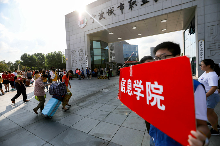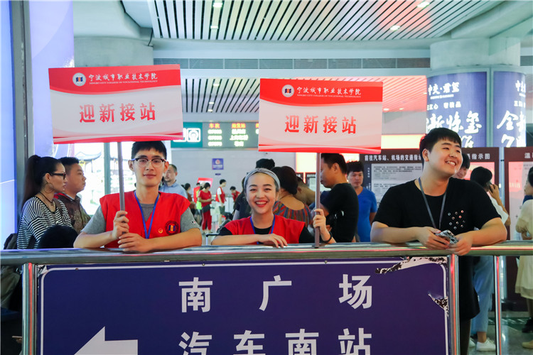 志愿者举着“迎新接站”牌,激动地等待新生。