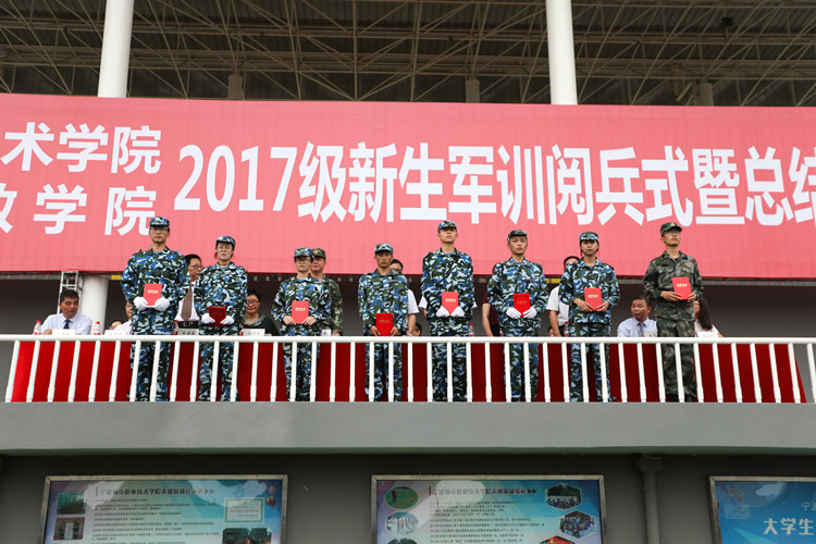 分列式结束后,副院长潘菊素宣读了军训各类先进名单,主席台领导为先进集体和个人颁发荣誉证书。