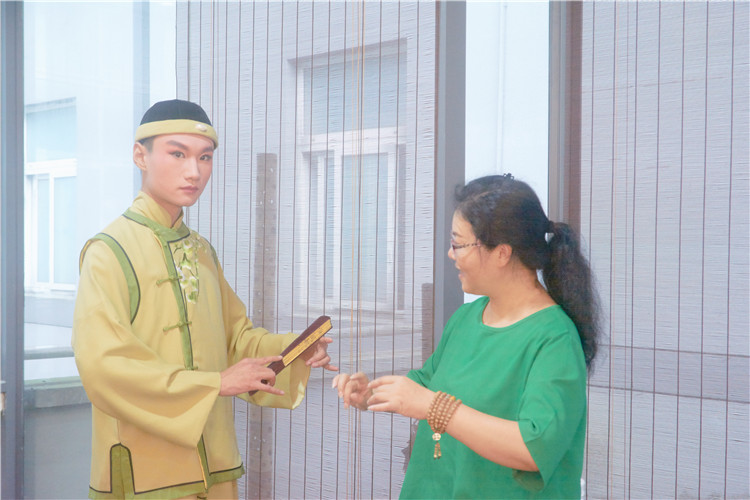 6月20日下午,在6号楼艺术学院CCC空间,甬剧表演者张海波、钱肖玲、王红刚、张瑜、李美霞等老师给校戏曲社成员和艺术学院学生带来了一堂生动有趣的甬剧美学文化体验课。这堂体验课,是我校宣传部、学生处、团委组织的“戏曲进校园”系列活动之一,也是给艺术学院学生一场体验甬剧妆容和服饰美学的专业体验课。甬剧艺术家们从甬剧妆容、戏曲服饰、动作仪态和神态表情等开展体验式讲授,学生从化妆服饰到表演进行了充分体验、受益匪浅。其中,甬剧表演者张海波老师,给学生进行甬剧动作示范,让学生感受戏曲文化的深厚美学与艺术魅力。