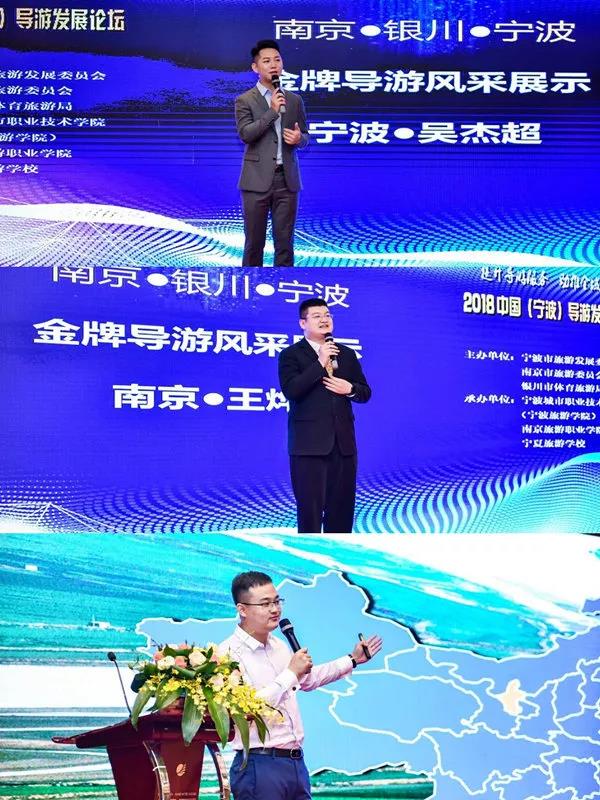 论坛现场,“倡议所有导游人员严于律己,作风优良;引导文明,注重质量;乐于奉献,敬业爱岗;三地旅委(局)充分认识到“居民导游”对全域旅游发展的重要促进作用,将致力开展兼职导游、特聘导游队伍的建设。应进一步发挥旅游主管部门及导游行业协会组织的作用,落实导游人员各项权益与保障,倡导共同营造导游队伍建设的良好氛围;指导、监督旅游企业落实导游人员合理的薪酬制度;出台激励措施,增强导游职业的吸引力,优化导游从业环境。三地旅游院校将开展全方位的合作,共同打造培养适合地方城市需求的高端导游人才”,随着“2018中国(宁波)导游发展论坛”宁波共识的发布,导游职业发展正能量响彻东海之滨、六朝古都和贺兰山脉,开辟了东西部政校合作异地共同培养导游人才的先河。其中,吴杰超、王烨、范城作为全国金牌导游,纷纷“代言”家乡美,向与会嘉宾展示了浙江宁波、江苏南京和宁夏银川的自然风光和风土人情,同时也展示了极佳的个人风采。