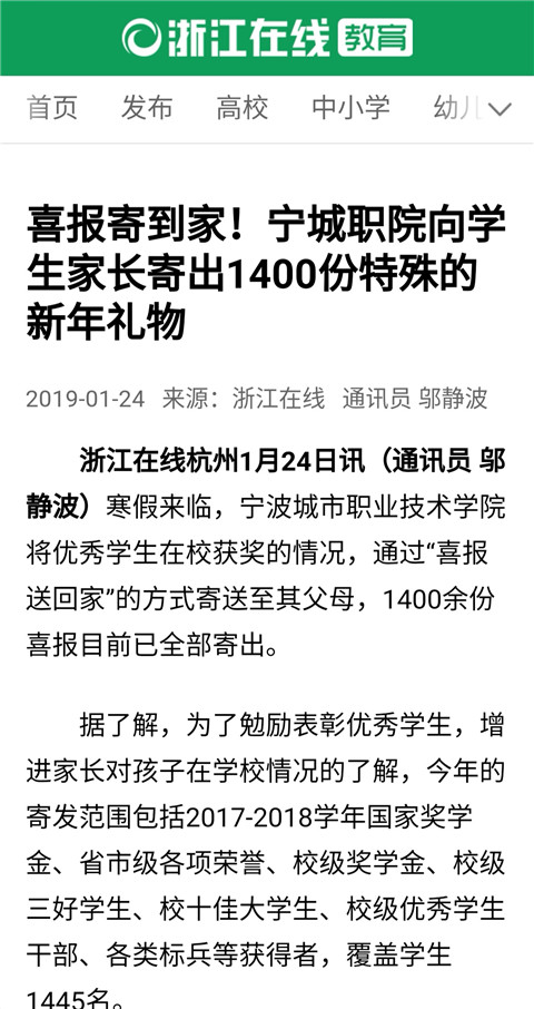 记者了解到,今年是该校首次开展“喜报送回家”活动。该校相关部门表示,此举措旨在更好地促进学生获奖思进,学校与家长同享学生成长过程中的收获与喜悦,鼓励更多的学生在今后的学习和生活中积极进取,争取获得更多的荣誉。学校还将为寒假留校的学生举办春节联欢会,让他们在校也能感受到新年的喜庆氛围,同时走访遍布瑞安、衢州等7个省内地级市的20位家庭经济困难学生。