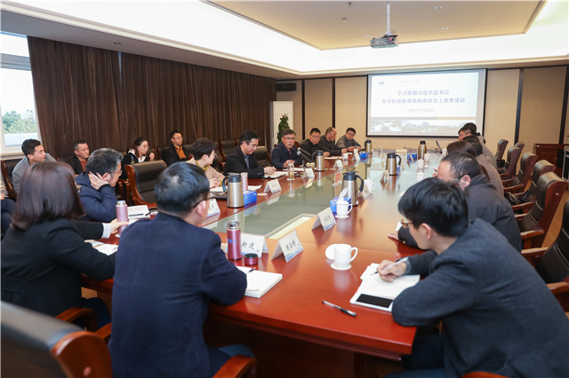 周国明强调,在深刻领会习近平总书记重要讲话精神的基础上做好贯彻落实工作,要处理好四对关系。一是处理好育人和育己的关系。打铁还需自身硬,自身过硬很重要,它是底气的基础。要做好老师,首先要做好人,让好人把人教好,让好老师教出好学生。要不忘初心,做个美好的人。心中有爱、懂得感恩、心存美好,是做一名好老师的基础。要不忘初心,担起崇高责任。选择做老师,就是选择了担当责任。既然选择了育人,就要勇敢地担起育人责任。要不忘初心,做好引路人。在培养学生的过程中,要按照“四个引路人”的要求,做到引路有方、引路有招、引路有效。育人先育己,教育者首先要成为信仰者。二是处理好作为和地位的关系。现在,思政课、思政队伍、思政教师的地位越来越高,我们更要提高责任意识,不断提高学生的认可度和获得感。要积极打造“金课”,在作用发挥上见真章,让思政课出彩,让思政教师出彩。要切实办好思政课,在课程建设、团队建设、教师培训等方面予以政策倾斜,在机构、人员、职称、待遇等方面采取有效措施。要构建“大思政”格局,建设专职为主、兼职结合的思政课教师队伍。要从三个层次推进“课程思政”建设,首先是思政元素的提炼,但要避免生搬硬套、生拉硬拽;其次是实现知识传授和育人的深度融合,全过程循序渐进,化“有意识”为“潜意识”;最后是注重言传身教,润物无声,做到“四个相统一”,做学生的“四个引路人”,成为“四有”好老师。三是处理好教学方法和教学有效性的关系。课堂是人才培养的最重要的阵地,没有之二。忘记课堂就意味着对教学的背叛。课堂教学质量是评价老师的最重要的依据,没有之二。要真正回归课堂,做到内心平静,不浮躁。教育信息化是现代教育的重要标志,但要避免陷入工具主义、功利主义,防止技术崇拜,要坚守传统教育中的精髓。要运用行之有效的教学方法来提高课堂教学的有效性,提高学生的获得感。四是处理好成长学生和成长自身的关系。要把成长学生放在首位,在成长学生的过程中成长自己,培养学生是每一位教师的初心和主业。周国明指出,学习贯彻习近平总书记重要讲话精神,要做到自己真信,让作用发挥,学生有获得感,在成长学生的过程中成长自己。