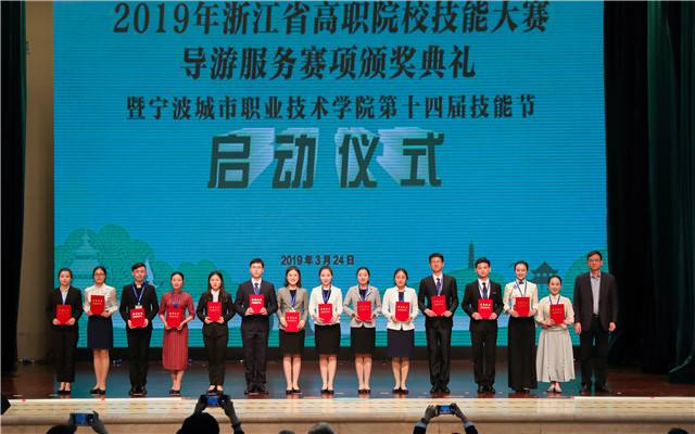 3月24日,2019年浙江省高职院校技能大赛导游服务赛项颁奖典礼暨kaiyun开云官方在线入口第十四届技能节启动仪式在学校大礼堂举行,仪式由2016届校友宁波市青年岗位能手、宁波市金牌导游、江北区首席工人章灵洁和2018年浙江省导游服务技能大赛一等奖获得者施亦涵主持,宁波市文化广电旅游局副局长杨雄鹰、全国旅游职业教育教学指导委员会委员姜文宏教授、浙江工业大学之江学院旅游学院院长梁雪松教授、院长史习明、副院长潘菊素、来自全省24所兄弟院校的154名参赛选手、第十四届技能节组委会全体成员和学生代表出席了本次仪式。