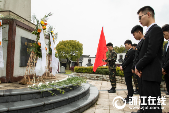成立暨出征仪式后,全体队员30余人随即奔赴浙东抗战老兵纪念园瞻仰先烈纪念碑,聆听革命事迹,向殉国的抗战将士敬献花篮。活动现场,学生手持鲜花,向抗战英雄雕像默哀……扫墓活动持续了两个小时,同学们深刻体会到清明节不仅是一个缅怀革命先烈的日子,更是审视自己,思考生命价值的日子。传承是最好的纪念。