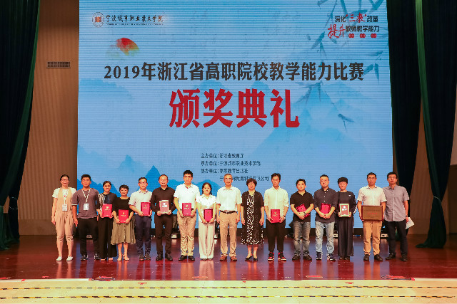 25日上午,2019年浙江省高职院校教学能力比赛颁奖典礼在我校大礼堂举行。专家委员会主任、浙江师范大学副校长李伟健,浙江省教育厅教师工作处副处长林涛,浙江省教育评估院院长施建祥,宁波市教育局高教处处长董刚出席颁奖典礼。院长史习明致欢迎辞。各组专家围绕参赛作品从课程思政、三教改革、信息技术与课堂教学深度融合、教学设计、教学实施、教学评价、新技术应用等角度总结优点亮点、分析存在问题、提出修改建议。会上表彰了2019年浙江省高职院校教学能力比赛一、二等奖获得者和最佳组织奖获奖院校。