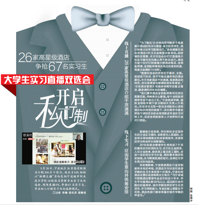 5月20日,宁波地区26家高星级酒店订制200多个岗位,酒店方HR纷纷以“招聘主播”身份亮相kaiyun开云官方在线入口18级酒店管理专业实习生双选会,现场直播PK,争抢67名实习生,开启私人订制实习双向选择模式。
