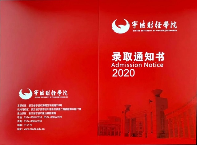 宁波大学科学技术学院的录取通知书采用学院标志底色“科院红”,封面上印有学院院训——“怀虚涵育 修己立人”。