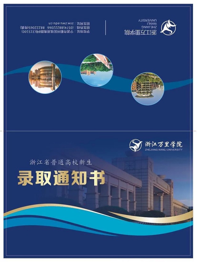 浙江万里学院的录取通知书以深蓝色为底调,封面印有学校的正大门图案,配以波浪图形,希望学子们在大学期间乘风破浪,有所收获和成就。