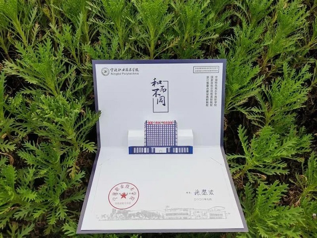 宁波职业技术学院的录取通知书为折页设计,中间“和而不同”四个大字是学校的校风,折页间的立体部分则以该校联盟大厦为原型。