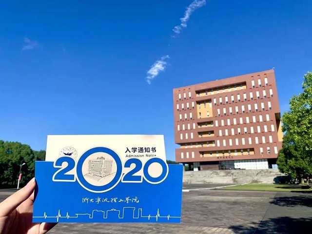 浙江医药高等专科学校的录取通知书以中国红为主色调,封面图形以英文校名(Zhejiang Pharmaceutical College)首字母 Z、J、P、C作为标志核心识别。