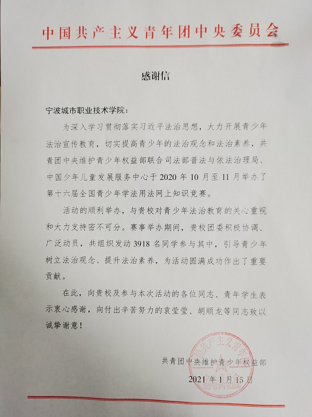为深入学习贯彻落实习近平法治思想,大力开展青少年法治宣传教育,切实提高青少年的法治观念和法治素养,共青团中央维护青少年权益部联合司法部普法与依法治理局、中国少年儿童发展服务中心于2020年10月至11月举办了第十六届全国青少年学法用法网上知识竞赛。近日,结果公布,我校在竞赛中荣获优秀组织奖。
