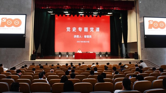在一个半小时的党课中,褚银良围绕中国共产党为什么能、马克思主义为什么行、中国特色社会主义为什么好、高质量发展建设共同富裕示范区等方面,紧密联系实际,与大家深入交流。他旁征博引,择取不同时期年轻共产党员的一封家书、一句话等微感情和小细节,娓娓道出其中蕴藏着的大时代、大战略的背景格局,深入浅出地为大家阐述了对党的百年历史的深刻认识,勉励大家从历史中汲取思想的力量、信仰的力量、道德的力量、实践的力量,坚定理想信念、奋发砥砺前行,为实现中华民族伟大复兴中国梦而努力奋斗。褚银良还立足鄞州,从区域发展过程中湾底村、奥克斯集团和高教园区的蝶变转身出发,把抽象的数据转化为直观的表述,带领大家感受“幸福生活是大家一起奋斗出来的”,坚信中国特色社会主义道路一定会越走越宽广。