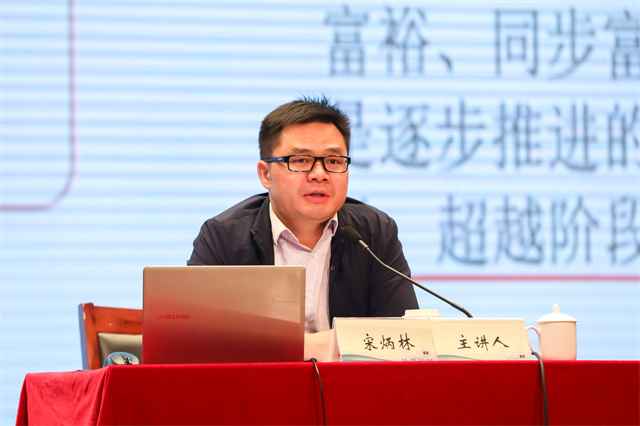宋炳林以《扛起宁波发展新使命 展现共同富裕新图景》为题,围绕深入学习贯彻习近平新时代中国特色社会主义思想、认真落实市委全会关于高质量发展建设共同富裕先行市的决议精神及行动计划,紧密结合我市实际,从“什么是共同富裕,宁波为什么要先行,宁波怎么干”三个层面深度剖析了《宁波高质量发展建设共同富裕先行市行动计划(2021-2025年)》的出台背景和具体内容,详细介绍了“物质基础、区域均衡、城乡一体、收入分配、生活品质、精神享有”六方面先行、高质量发展等18个共富“密码”,深刻阐述了推动共同富裕的重大意义、深刻内涵、核心要点和实现路径。