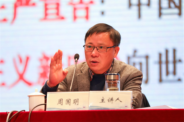 讲到“党的百年奋斗历程的历史意义和历史经验”时,周国明指出,党的百年奋斗从根本上改变了中国人民的前途命运,开辟了实现中华民族伟大复兴的正确道路,展示了马克思主义的强大生命力,深刻影响了世界历史进程,锻造了走在时代前列的中国共产党;凝聚了坚持党的领导、坚持人民至上、坚持理论创新、坚持独立自主、坚持中国道路、坚持胸怀天下、坚持开拓创新、坚持敢于斗争、坚持统一战线、坚持自我革命等具有根本性和长远指导意义的十条历史经验。