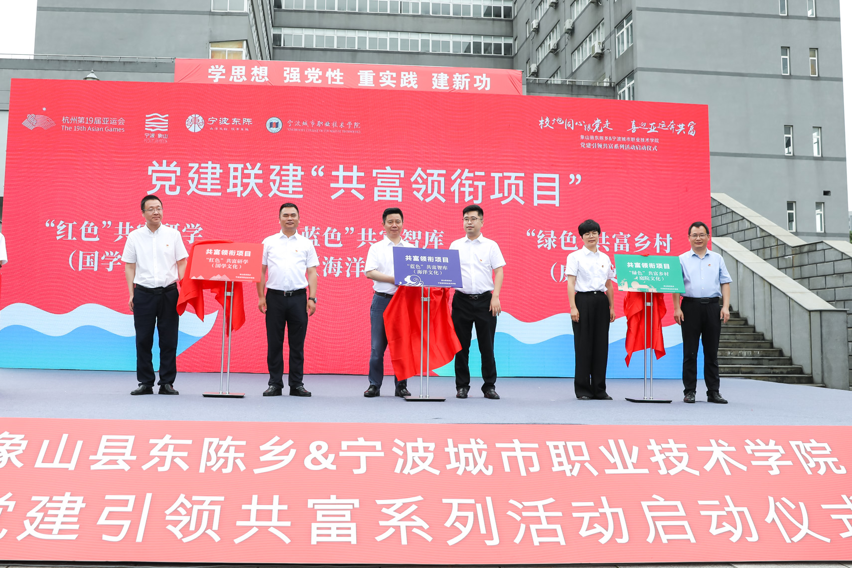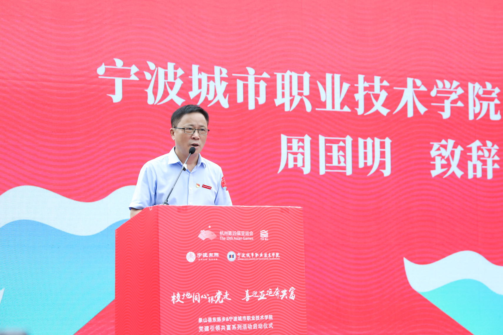 周国明在致辞中指出,全面推进乡村振兴是党建引领共富、推动乡村高质量发展的必然要求,要深入贯彻习近平总书记关于乡村振兴的重要指示精神,以主题教育为契机,开展好党建引领共富系列活动,实现校地共富发展。他表示,在前期对接中,学校深入各村社进行需求调研,结合学校专业优势和东陈乡资源优势,提出了以“国学文化”“海洋文化”“庭院文化”为核心的三个共富领衔项目,下步学校将以需求为导向,以领衔项目为依托,发挥学校现代服务业的办学特色和人才高地优势,助力东陈乡在党建品牌打造,农村电商、乡村文旅等产业上打响品牌,形成一批具备校地标识度的共富品牌,擦亮象山亚运名片。