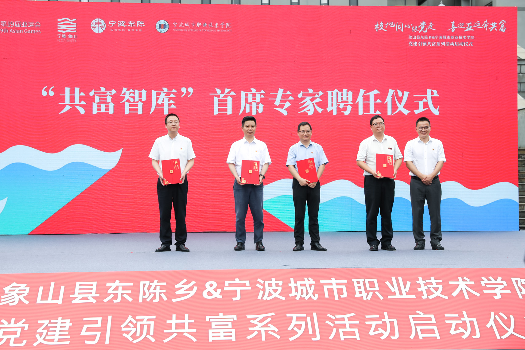宁波城市职院组织部部长傅祖栋教授,商学院院长胡坚达研究员,景观生态学院院长吴立威教授,继续教育学院院长、宁波民宿协会会长朱建国被聘任为东陈乡“共富智库”首席专家,他们将为当地的党建工作、农村电商、旅游发展等提供专业、技术和智力支撑。