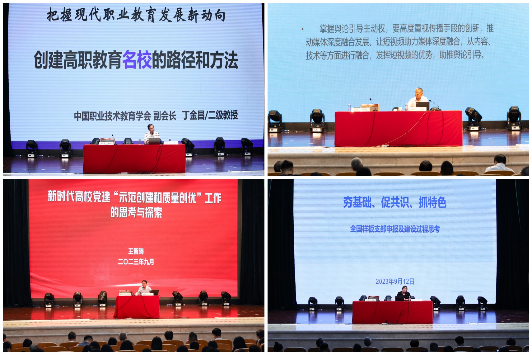 会议邀请中国职业技术教育学会副会长、中国职业技术教育学会高职分会会长丁金昌,宁波市政府新闻办副主任徐猛挺,第三批全国党建工作标杆院系、宁波大学机械工程与力学学院党委书记王智腾,第三批全国党建工作样板支部、宁波职业技术学院阳明学院直属党支部书记王青柳,分别就高等职业教育、意识形态、高校党建“双创”等工作作了专题辅导。
