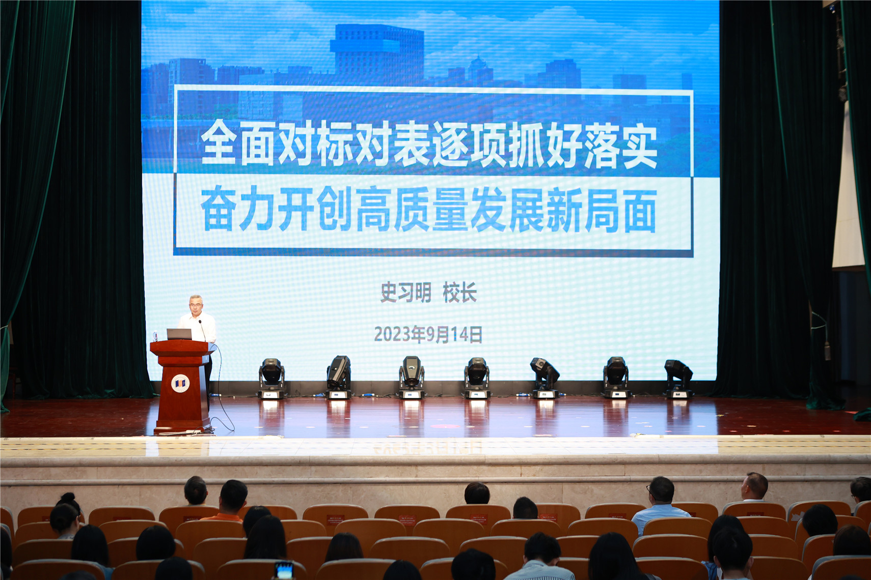 史习明在专题报告时指出,三天的学习安排紧凑、授课精彩、内容丰富,既是一次高质量党建的培训会,也是一次职业教育新理念的学习会,更是一次学校新目标的动员会,大家要将此次培训会学习的理论知识、经验做法同学校实际、岗位实际紧密结合起来,在时代大局中找准正确方向、在履职尽责中锻造过硬本领、在事业发展中发挥关键作用。史习明充分肯定了暑期里广大教职工加强学习实践、提升专业能力,相关单位(部门)坚守岗位、奋战一线的态度和精神,他表示,没有教职工的成长就没有学校的发展,每个人找准定位、干好本职工作,就是在为学校发展做贡献。史习明强调,高质量完成下半年工作至关重要、意义深远,一是要高质量完成省“双高”建设任务;二是要细化新一轮人才培养方案;三是要进一步完善教育评价改革;四是要扎实推进校友工作;五是要办好二十周年校庆;六是要筹备召开思政工作大会;七是要完成内部质保体系诊改复核;八是要高质量完成发展规划制定。各单位(部门)要全面对标对表、逐项抓好落实,持续巩固深化主题教育成果,奋力开创学校高质量发展新局面。