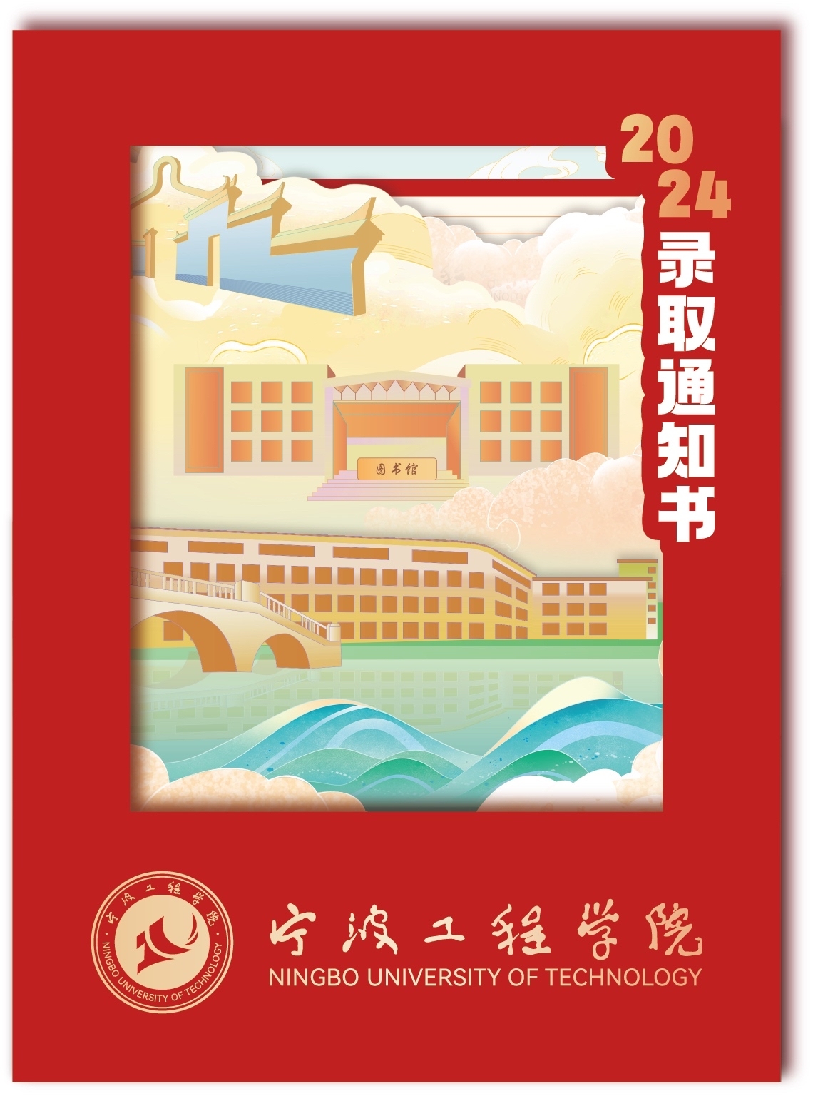 宁波工程学院2024级新生录取通知书通体以红底筑基,辅以烫金线条突出细节,红与金的碰撞,搭配四折内芯,体现出赤诚、旺盛的生机与活力。