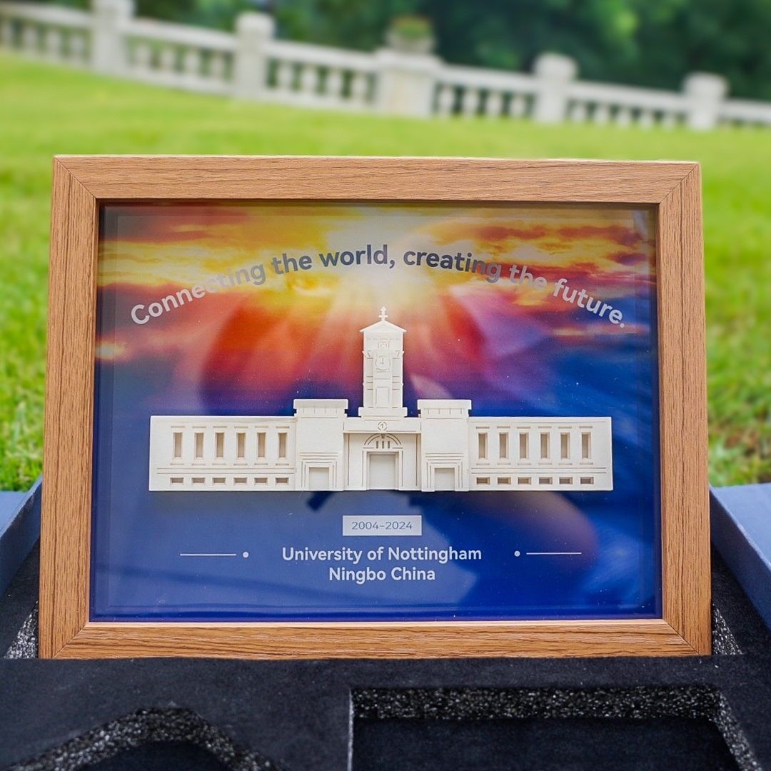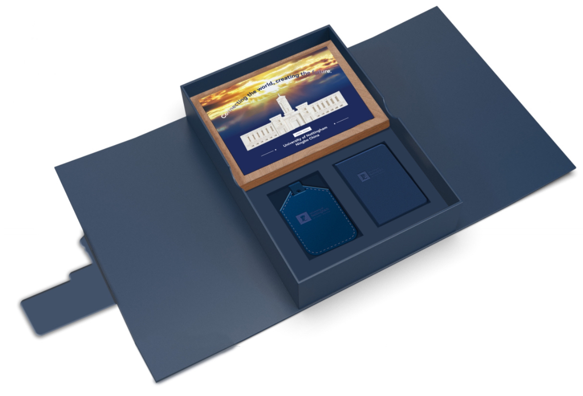 录取通知书之下是一幅宁诺钟楼光影画。当夜幕降临,连接电源、轻触背面开关,钟楼瞬间沐浴在流光溢彩之中,不仅照耀书桌,更燃梦心灯!此外,礼盒内的精致护照夹与行李牌,则是宁诺给予新生的特别礼物,它们不仅实用,更富含深远的意义——鼓励宁诺学子从钟楼出发,怀揣梦想、走向世界,开启属于自己的精彩人生!
