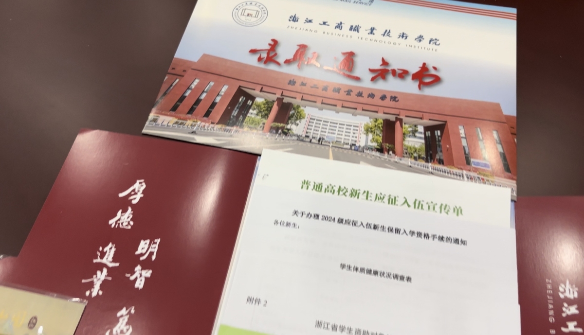 浙江工商职业技术学院录取通知书以红色作为主色调,采取了封套加通知书内页的组合方式。