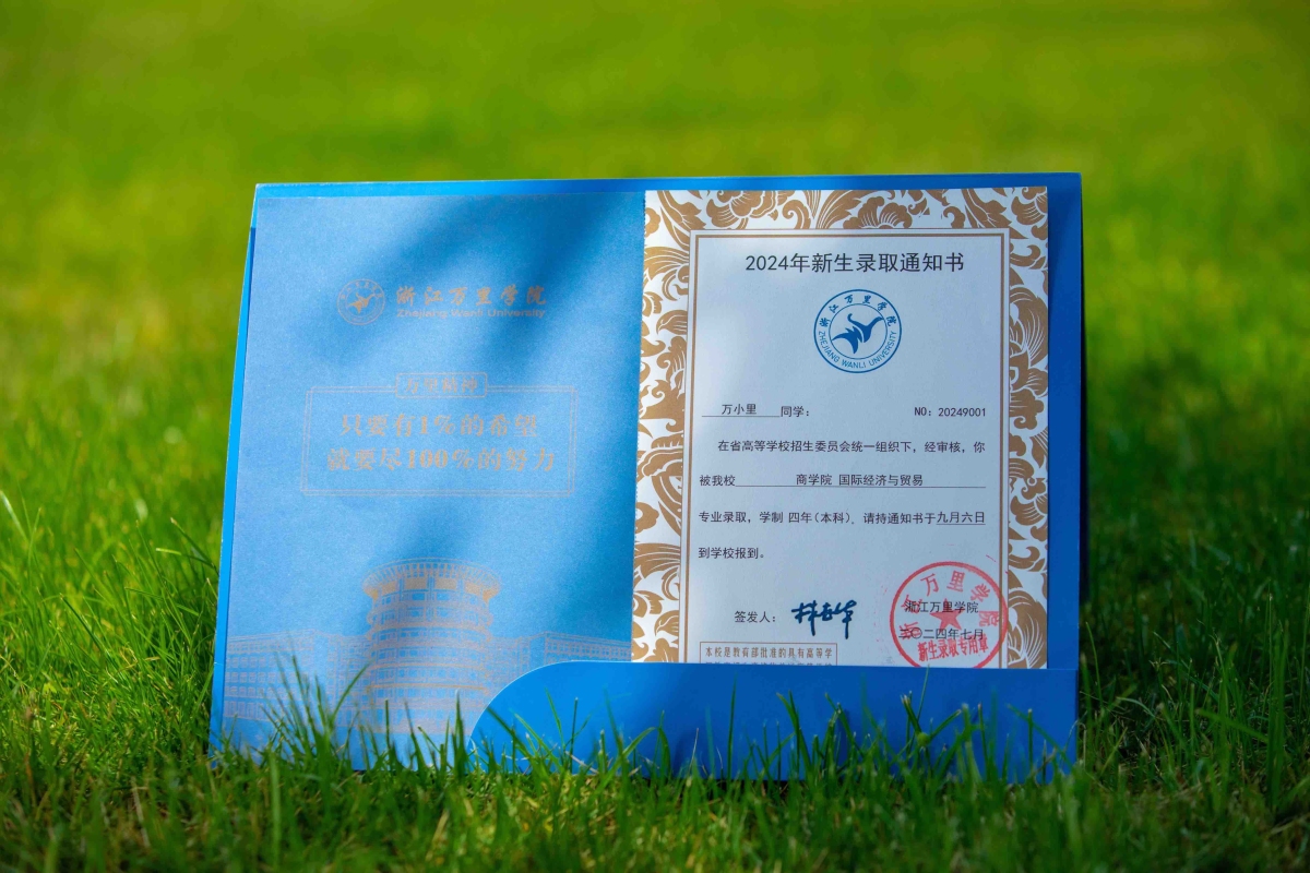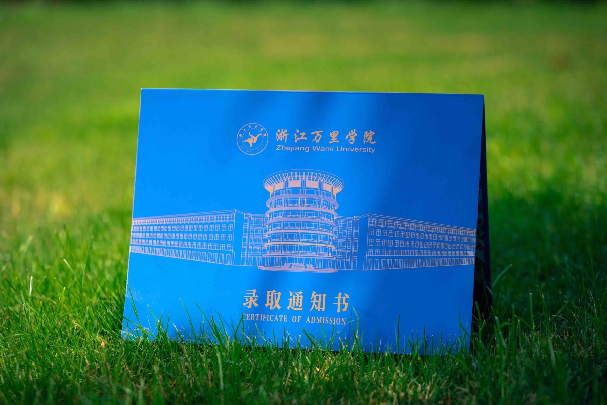 浙江万里学院录取通知书,采用了“万里蓝”的主色调,金色线条的勾勒将学校的地标性建筑“空中花园”跃然纸上。朱红的外壳、深蓝的内夹、金色的线条,彰显着低调与稳重。