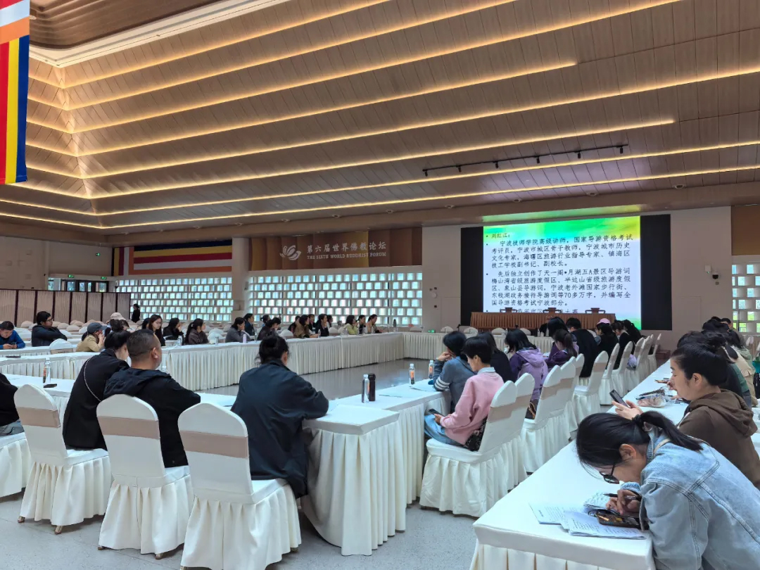 跟随专业讲解员的步伐,学员们开展讲解实训,逐一参观了弥勒圣坛未来广场、奉化博物馆分馆、时光甬道、万善堂、须弥山等,让手中的讲解词变得立体生动。