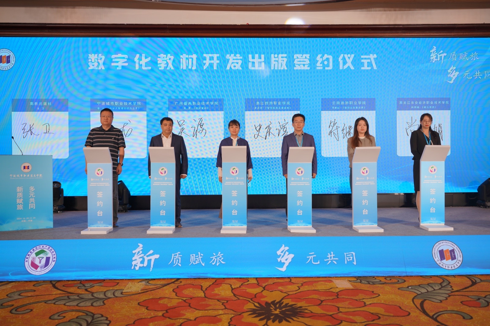 会议上举行了产教融合共同体签约仪式,围绕“新质赋旅、多元共进”的主题,聚焦“夯实‘五金’新基建、突出数智化课程建设”,计划在数字化教材开发与出版、数智化校企合作课程研发、旅游职业教育数智化实训基地共建、数智文旅联合实验室创建、数智化“金课”建设等方面展开深入合作与开发。