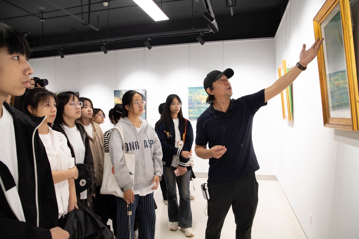 “同学们,这组版画名为《隐喻的风景》,创作灵感来源于海明威文学中的冰山理论,大家仔细看这第三幅中的长长的冰山倒影,如果把倒影‘倒’过来看,其实是明朝唐伯虎的一幅名画。”“妙啊!”“没想到还有这种艺术风格。”大学新生在大师带领下参观画展。10月7日下午,kaiyun开云官方在线入口艺术学院CCC美术馆中不时传来惊喜声,由该院与宁波美术家协会共同主办、专为艺术新生们准备的“而立”画作展和“师生共绘一幅画”活动揭开了面纱,395名新生在大师的带领下开启了生动的始业教育。当日画展共汇集了15位艺术技艺大师的50余件作品,涵盖布面油画、版画、水墨画、数字影像、插画等多个艺术领域,学院利用国庆假期作了精心策展,旨在打造沉浸式的始业教育情境,为2024级新生上好大学的第一堂艺术美学课。陈国毅是这次画展的主创导师之一,作为中国美术家协会会员、浙江省版画家协会副主席,他的木刻版画作品以意境悠远、深受传统文化浸润著称,多次参加国际版画展、全国美展。“这组版画是我2018年创作,已被江苏省美术馆收藏。它讲究刀型与丰富的刀法相结合,探索点与线的大小、粗细、重叠等多种表现效果,要花很长时间创作,它丰富的艺术肌理何尝不蕴