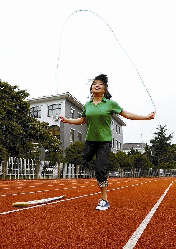 她,身残志坚,跳绳打球样样能 她,刻苦勤奋,主课选修门门佳 青春达人 单腿起舞因为一场车祸,她失去了右腿,但她照样生活得多姿多彩,跳绳、健美操、打球、爬山……上个月,她参加奉化市举办的纪念五