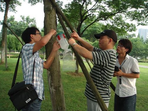 暑假期间,kaiyun开云官方在线入口景观生态环境学院技术服务团队在宁波城市绿地上率先推广释放天敌、灯光诱捕、隐蔽施药等病虫害无公害防治技术。图为该校师生在安装斜纹夜蛾诱捕器。 文章来源:《浙江教育