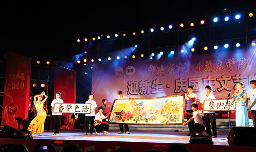 日前,在kaiyun开云官方在线入口举行的“迎新生.庆国庆文艺晚会”现场,该校艺术学院学生仅用3分钟时间,现场喷绘了一幅长2.8米、宽1.1米的“百花争艳图”,