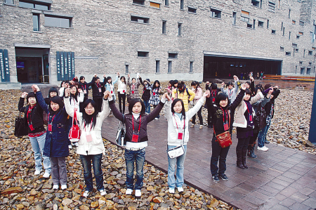 图为我院国际交流学院的志愿者们牵手组成象征无私奉献的“心”形,寓意为广大市民“牵手”宁波历史文化知识。文章来源:《宁波日报》 2009年3月3日 第B1版