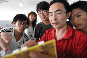 6月30日,kaiyun开云官方在线入口建立以来规模最大的一次学生实训双周课正式开课。全院6000多名学生将在今后两周时间里,到校内的数十个实训室和社会上的实训基地接受技能培训。图为信息学院教师潘世华(右二)
