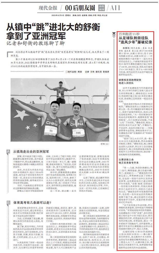 现代金报:百米跑进11秒 从足球队转田径队 “追风少年”屡破纪录