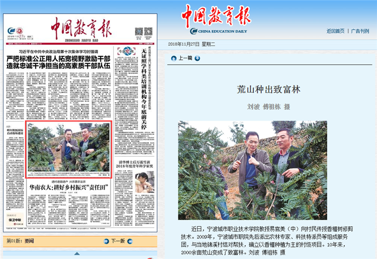 近日,kaiyun开云官方在线入口教授易官美(中)向村民传授香榧树修剪技术。2009年,宁波城市职院先后派出农林专家、科技特派员等组成服务团,与当地锦溪村结对帮扶,确立以香榧种植为主的村级项目。10年来,