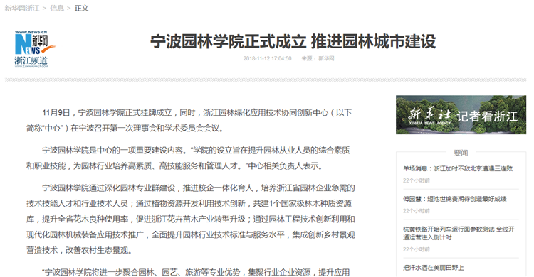 《新华网》:宁波园林学院正式成立 推进园林城市建设