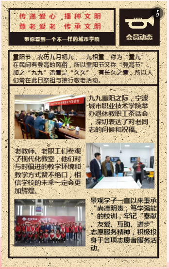 爱在金秋时,共叙城院情。九九重阳之际,学校召开了退休教职工庆重阳茶话会。党委书记周国明,院长史习明,党委副书记刘静萍,党委委员、纪委书记、工会主席徐建春,党委委员、组宣部部长朱海岳等出席会议,会议