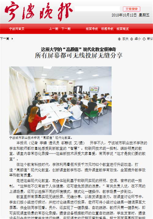 《宁波晚报》:这所大学的“高颜值”现代化教室很神奇,所有屏幕都可无线投屏无缝分享